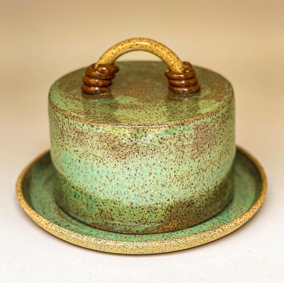 Queijeira em Cerâmica com acabamento Verde Green Tea (efeito) e com Interior Incolor, para seu queijo estar sempre fresco, mesmo fora da Geladeira